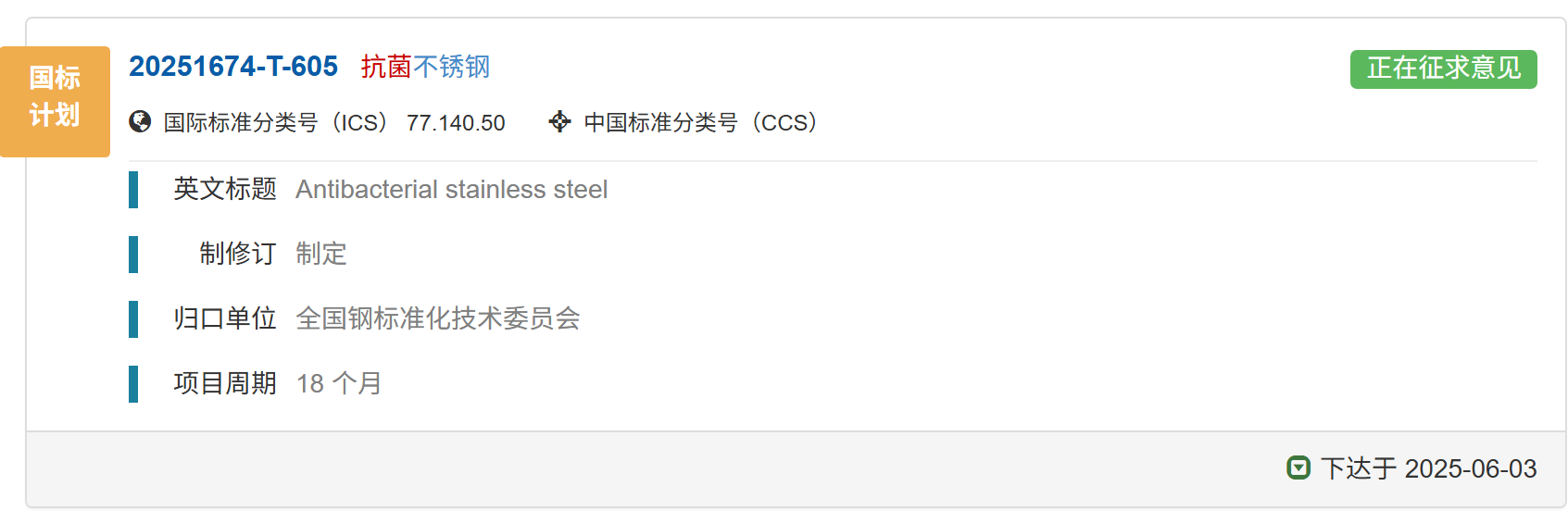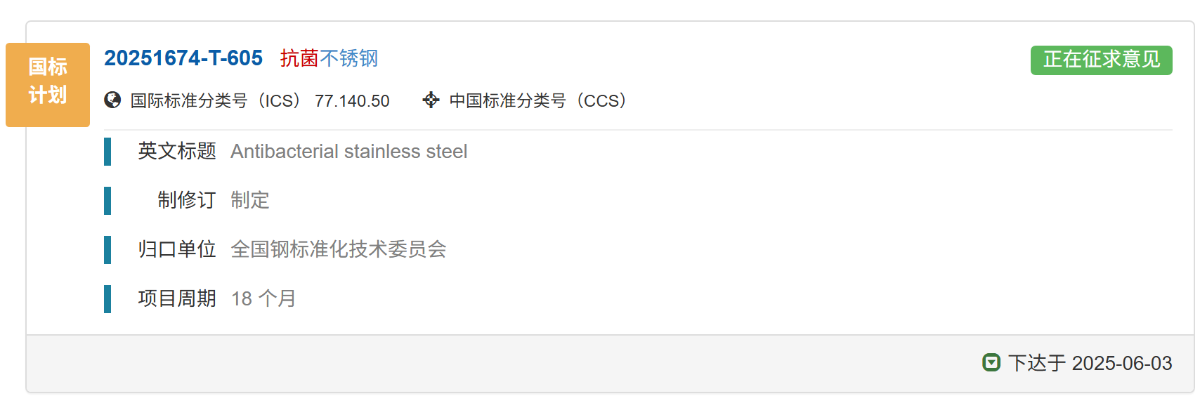 國(guó)家標(biāo)準(zhǔn)《抗菌不銹鋼》正在征求意見中,歡迎報(bào)名成為參編單位并提出修改意見和建議。01 國(guó)家標(biāo)準(zhǔn)計(jì)劃《抗菌不銹鋼》已下達(dá)國(guó)家標(biāo)準(zhǔn)計(jì)劃《